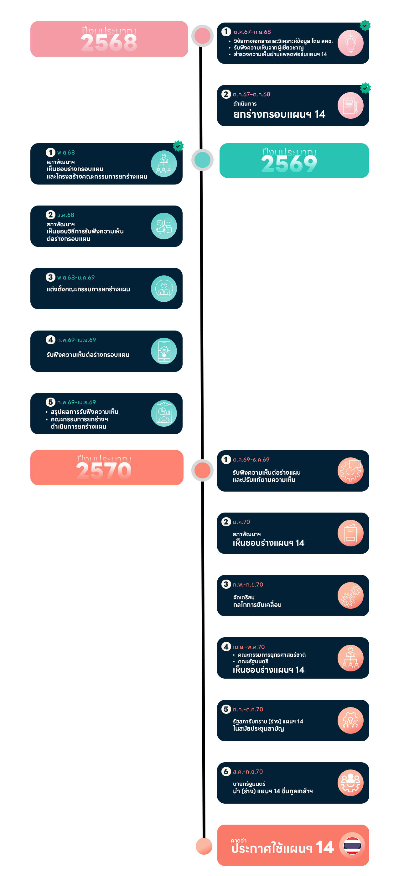 ก้าวต่อไปของแผน 14 ติดตามความก้าวหน้า ติดตามความก้าวหน้า กรอบระยะเวลาการจัดทำแผนพัฒนาฯ ฉบับที่ 14 (พ.ศ. 2568 – 2570) กรอบระยะเวลาการจัดทำแผนพัฒนาฯ ฉบับที่ 14(พ.ศ. 2571 – 2575)